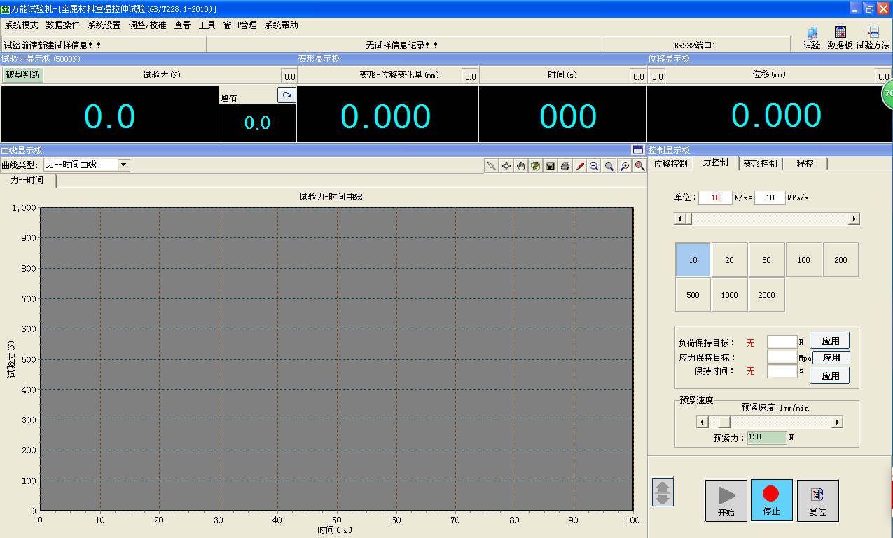 4、同時記錄力-時間,變形-時間,位移-時間、應力-時間、應變-時間、力-變形、力-位移、應力-應變等試驗曲線,可隨時切換觀察;任意放大縮小,水平或垂直移動,實時高速采樣;
